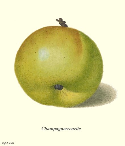 | Synonyme: Bovinski M.f.Pomm.133, Champagner Reinette IH.47, Champaigne Reinette DOW.122, Glas Apfel LucKW.72, Laskrieger THOM.347, Loskrieger, Reinette Blanche de Champagne LER.374, Reinette de Champagne Mas.53 |